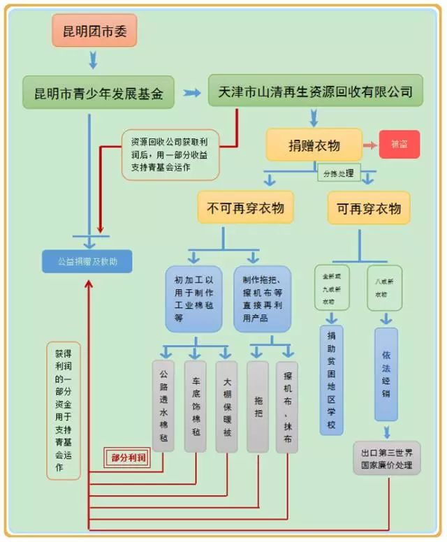 为此,2018年3月15日,昆明市青年志愿者服务指导中心主任,昆明市青少年发展基金会执行会长叶波、昆明市青少年发展基金会理事长田颖、执行秘书长刘葵还前往富民县对天津市山清再生资源回收有限公司在滇工厂进行实地的调查访谈,了解旧衣物的处理办法。