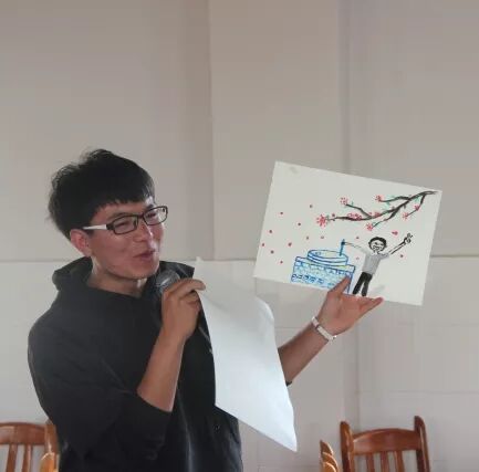 在梨膏义卖活动上介绍自己小队的绘画作品。