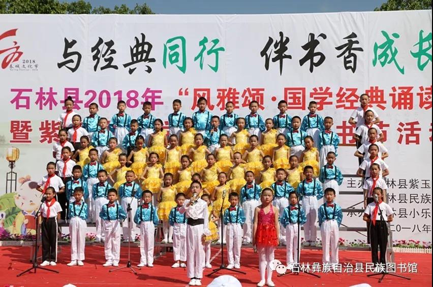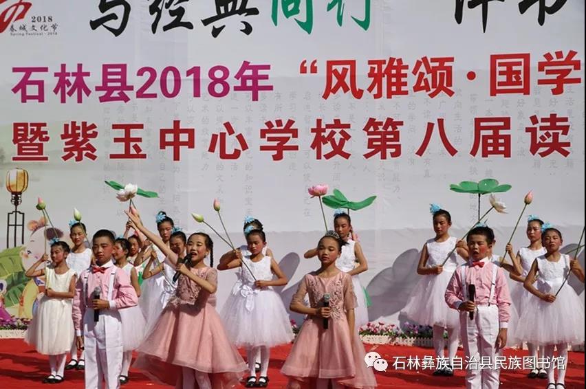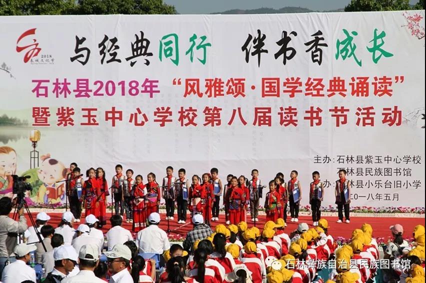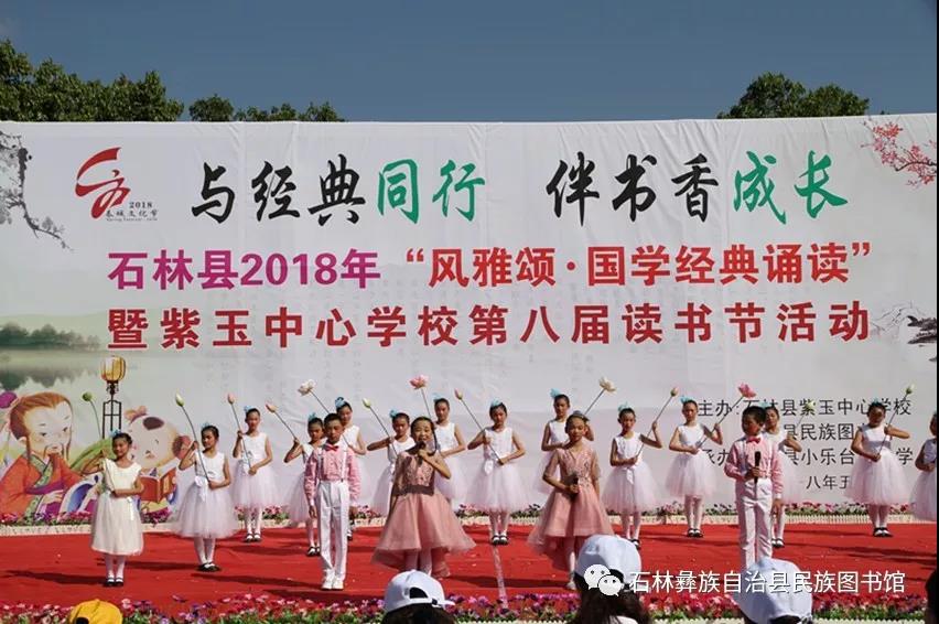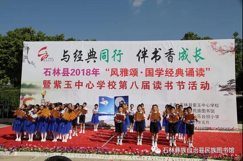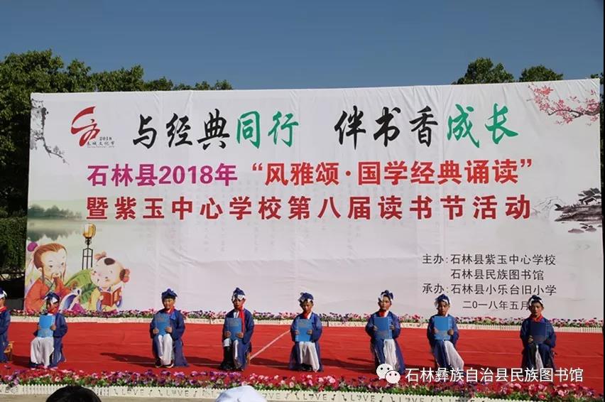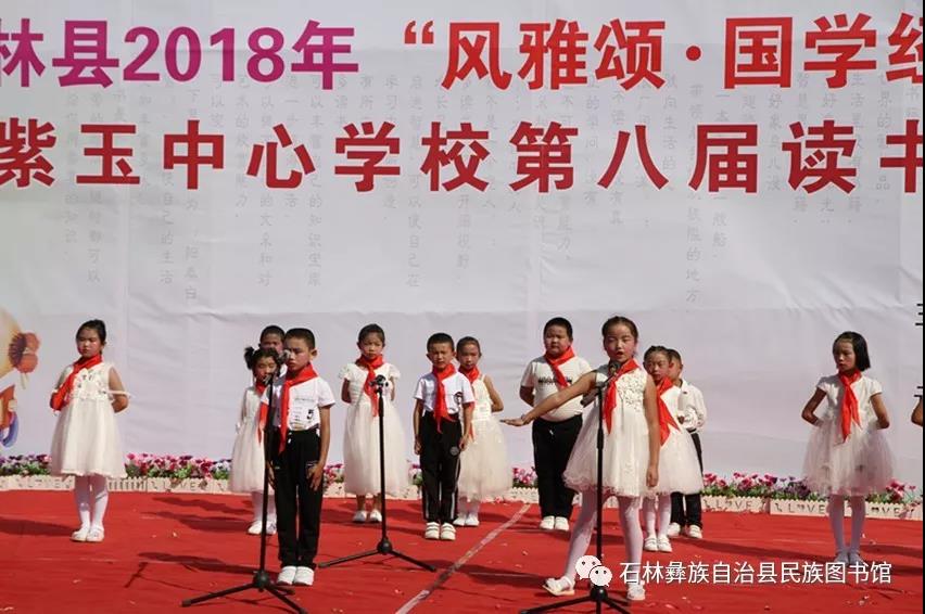 为深入宣传贯彻习近平新时代中国特色社会主义思想和党的十九大精神,持续推动全民阅读深入开展,不断提高“书香石林”建设水平,努力打造国际知名旅游胜地。根据《云南省深入开展全民阅读实施意见》、《昆明市2018年全民阅读工作实施方案》、《中共石林县委宣传部关于印发<石林彝族自治县2018年全民阅读工作实施方案>的通知》(石宣发[2018]5号)等文件精神,结合西南四城市开展的“风雅颂·国学经典诵读”活动要求,由石林县民族图书馆、石林县紫玉中心学校共同举办的2018年春城文化节“与经典同行,伴书香成长”—石林县2018年“风雅颂.国学经典诵读”暨紫玉中心学校第八届读书节活动于5月16日在大乐台旧小学隆重举行。石林县紫玉中心学校的紫玉小学、上蒲草村小学、小乐台旧小学、阿乌小学、大乐台旧小学等12所小学的师生近1000余人参加了活动。