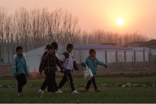 ▲夕阳西下,杭头村的孩子们放学了约着去图书馆看书。胡弘彪|摄