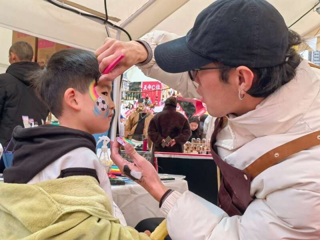 摊主粟炜炜忙得不亦乐乎,他是一名青年创业者,主营赛事周边脸绘。开赛前2个多小时,他就给50余人进行了脸绘。